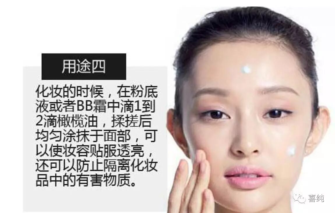 化妆的时候,在粉底液或者BB霜中滴1-2滴橄榄油,揉搓后均匀涂抹于面部,可以使妆容贴服透亮,还可以防止隔离化妆品中的有害物质,而且MM们再也不用担心会掉妆啦;卸妆的时候,在化妆棉上滴两滴橄榄油来卸妆,用法就相当于卸妆油,比卸妆油更加有利于皮肤健康哦!