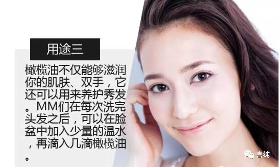 橄榄油不仅能够滋润你的肌肤、双手,它还可以用来养护秀发。MM们在每次洗完头发之后,可以在脸盆中加入少量的温水,再滴入几滴橄榄油,特别干燥的发质,可以多滴一些,然后,再来擦拭一遍秀发,经常使用,可以令秀发变得格外柔顺和光滑,同时,还能够预防头屑生成、避免脱发掉发、头发干枯毛躁等多种问题的发生。