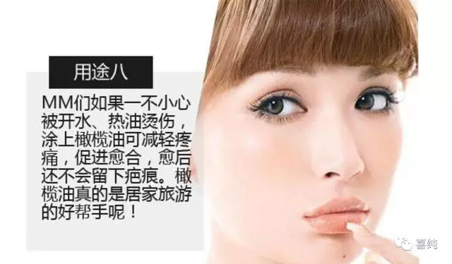 MM们如果一不小心被开水、热油烫伤,涂上橄榄油可减轻疼痛,促进愈合,愈后还不会留下疤痕,橄榄油真的是居家旅游的好帮手呢!