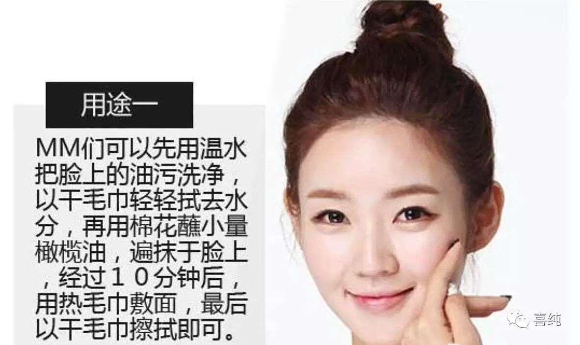 可以先用温水把脸上的油污洗净,以干毛巾轻轻拭去水分,再用棉花蘸小量橄榄油,遍抹于脸上,经过10-15分钟后,用热毛巾敷面,最后以干毛巾轻轻擦拭即可;同样洗完澡后在一杯水里加入一些橄榄油拌均匀,分次淋在身体的每一个部位,再适当地按摩,可以使皮肤更光滑。