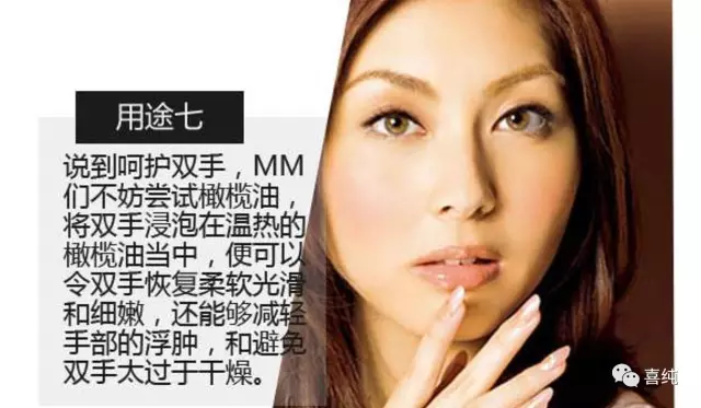 双手是女人们的第二张脸,一双粗糙干燥的手非常有损美眉们的形象,因此,双手要赶紧呵护起来哦。而说到呵护双手,MM们不妨尝试橄榄油,将双手浸泡在温热的橄榄油当中,便可以令双手恢复柔软光滑和细嫩,还能够减轻手部的浮肿,和避免双手太过于干燥,同样的道理,橄榄油还可以用来滋润双脚,令双脚肌肤更加柔软。